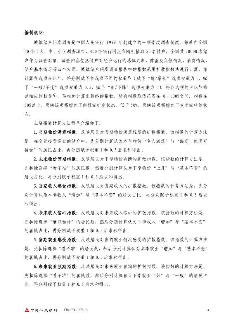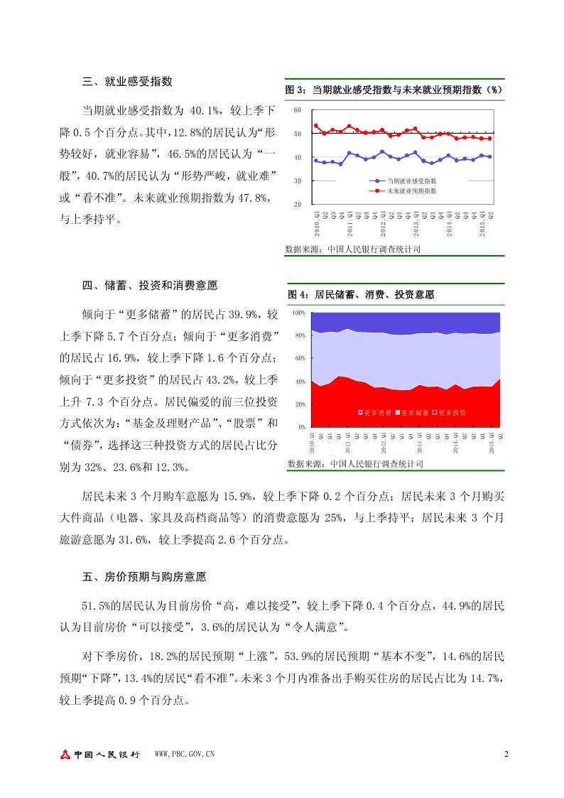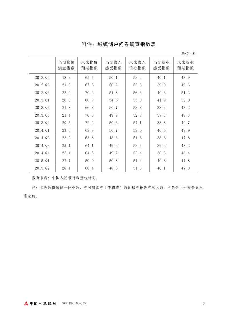央行:2015年二季度城镇储户调查报告 2015年第二季度城镇储户问卷调查报告,报告显示,逾五成居民预期三季度房价“基本不变”。对于现阶段房价,过半居民认为难以接受,但购房者的购房意愿却较一季度有所提高。 报告显示,在房价预期与购房意愿方面,对三季度房价,18.2%的居民预期“上涨”,53.9%的居民预期“基本不变”,14.6%的居民预期“下降”,13.4%的居民“看不准”。对于现在的房价,51.5%的居民认为目前房价“高,难以接受”,44.9%的居民认为目前房价“可以接受”,3.6%的居民认为“令人满意”。 更多阅读:中国人民银行:2019年第一季度城镇储户问卷调查报告央行:2015年第四季度城镇储户问卷调查央行:2019年第四季度城镇储户问卷调查报告中国人民银行:2023年第一季度城镇储户问卷调查报告央行:2015年第三季度企业家问卷调查央行:2015年第三季度银行家问卷调查报告央行:2017年9月境外机构和个人增持1129亿元A股央行:截至2021Q2 ATM机具98.67万台 同比减少6.54万台央行:2014上半年全国小额贷款公司贷款余额8811亿 新增618亿央行:2019年第四季度银行家问卷调查报告央行:2013年中国移动支付业务接近17亿笔 金额9.64万亿 同比增长212% 央行:2017年四季度中国货币政策执行报告央行:2013年Q2中国支付体系运行总体数据央行:2014年4月中国金融统计数据报告央行:2014年11月份新增表内人民币信贷8527亿元 明显超过市场预期