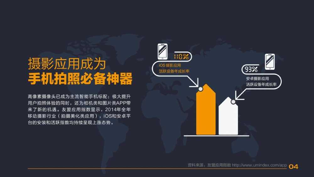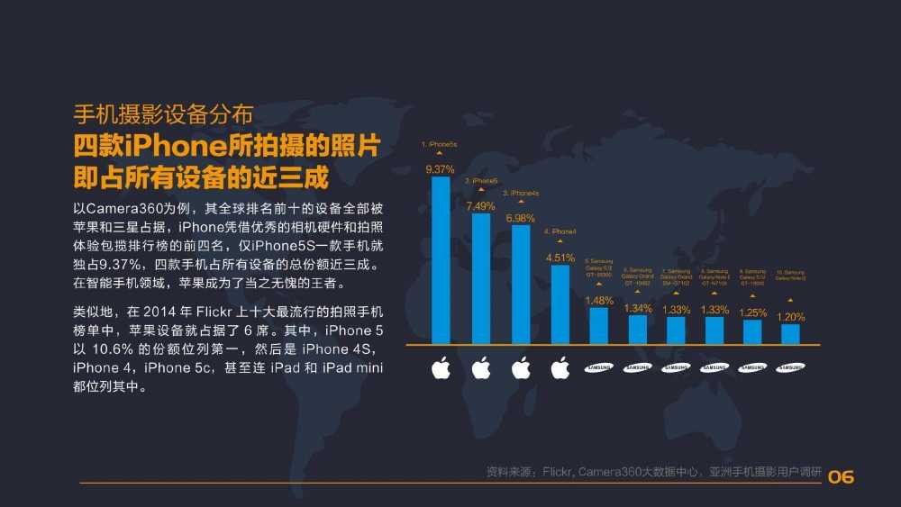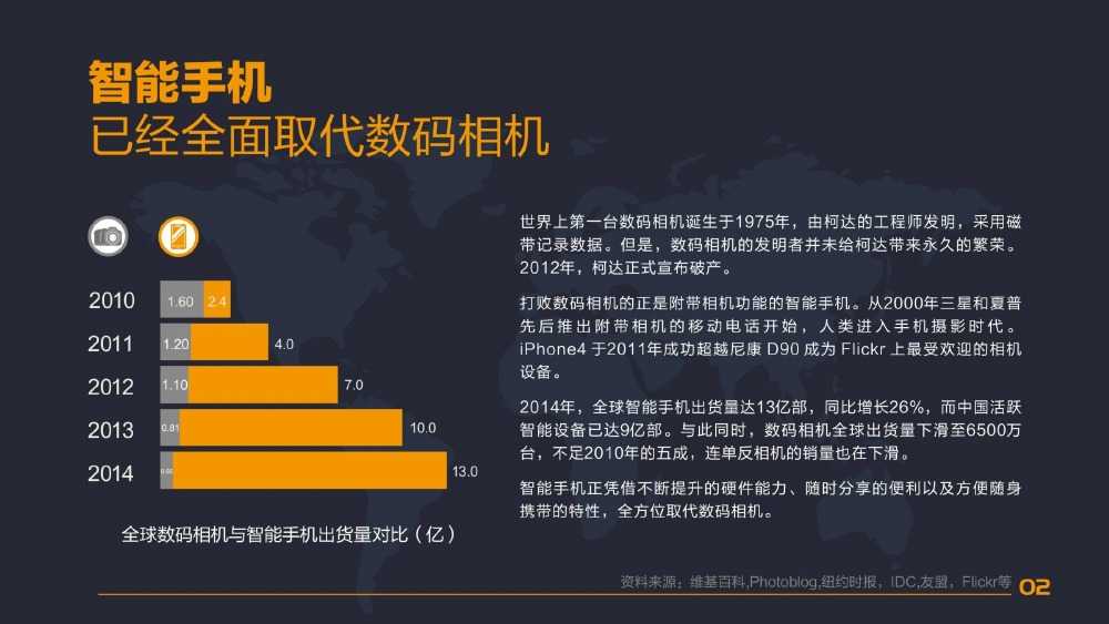 如今的智能手机拥有几乎媲美专业相机的硬件配置,更拥有专业相机无法比拟的即时分享与随身携带的特性。报告显示,2014年,全球智能手机出货量高达13亿部,仅中国活跃智能设备就高达9亿部。与此同时,数码相机全球储量下滑至6500万台,不足2010年的五成。
