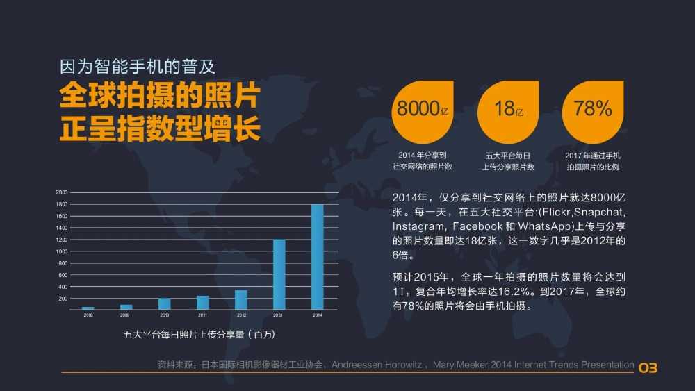 由于智能手机的普及,全球拍摄的照片数量呈指数增长,预计到了2017年,全球78.8%的照片将由手机拍摄产生。作为在全球拥有超4.5亿用户数的相机360,单日产生照片数高达2亿张。如果全部冲洗出来,其叠放在一起的高度相当于珠穆拉玛峰的7倍!