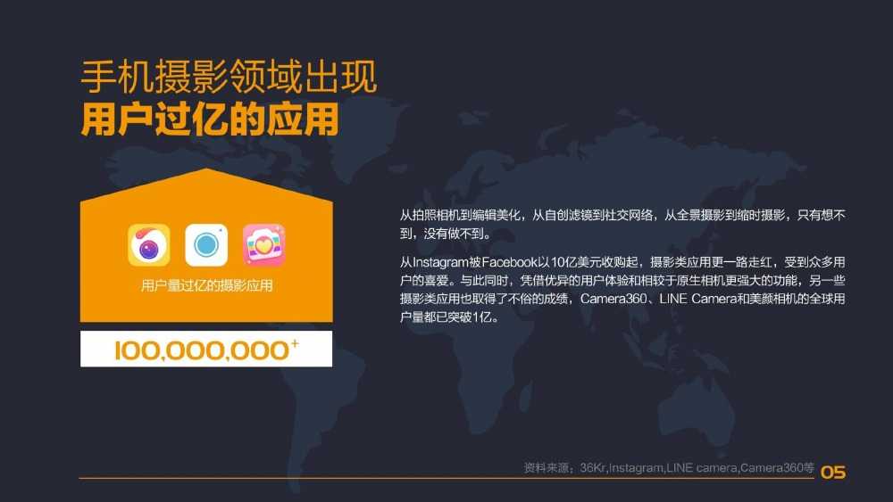 高像素摄像头已成为主流智能手机标配,在极大提升用户拍照体验的同时,为摄影类和图片类App带来了新的机遇。据报告显示,约四分之三的受访用户倾向使用第三方摄影应用。从便捷的拍照相机到强大的编辑美化功能,从自创滤镜到社交网络,从Instagram被Facebook以10亿美元收购起,摄影类应用更是一路走红。