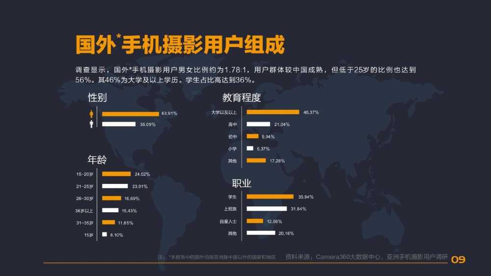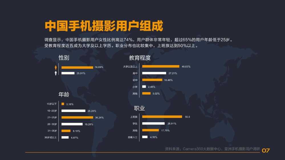 亚洲的手机摄影用户群体偏向年轻化。56%的海外用户年龄低于25岁;而中国用户群体中有高达65%的用户年龄低于25岁。有趣的是,国内外手机摄影用户男女比例几乎相反。中国用户男女比例1: 2.8,而海外用户男女比例为2.78 :1。