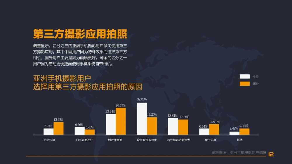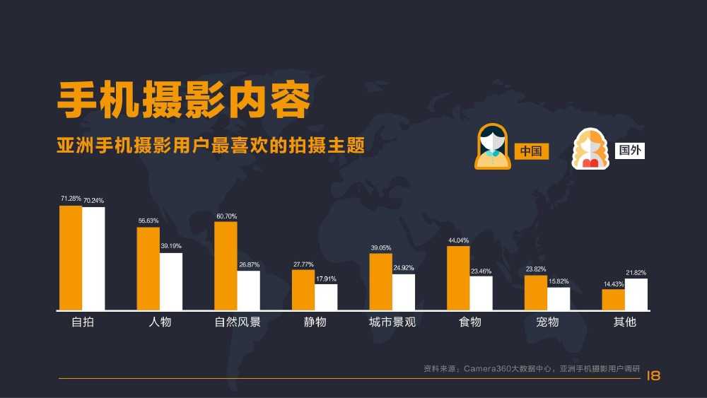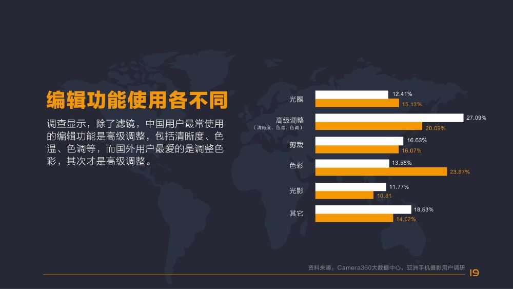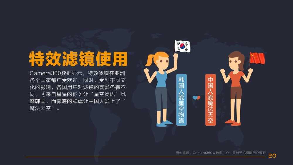 据相机360发布的数据显示,特效滤镜与图片高级编辑在亚洲各个国家都广受欢迎。这正好满足了用户使用第三方摄影类应用的两大痛点:特殊效果与成像质量。