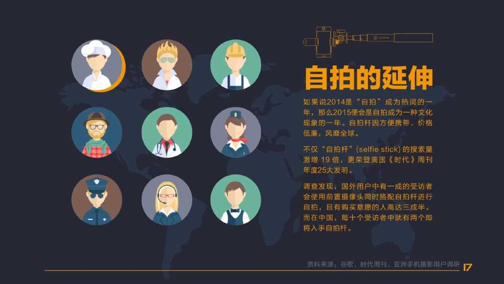 值得一提的是,“自拍这件大事”更为移动摄影行业开拓了一片全新的领域-自拍杆。自拍杆因方便携带、价格低廉,而风靡全球。不仅“自拍杆”的搜缩量激增19倍,更被美国《时代》周刊评选为年度25大发明。2015年,自拍将成为一种文化。