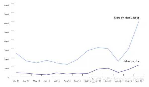 YOOX目前Marc by Marc Jacobs的产品数量是Marc Jacobs的1.29倍,而著名买手电商网站Farfetch的副牌数量是主牌的4倍。平均下来,全球范围内,Marc by Marc Jacobs的库存数量是Marc Jacobs的四倍。甚至在Marc Jacobs的自己官网上,Marc by Marc Jacobs的数量也是Marc Jacobs的两倍。再看从去年三月份到今年的这段时间内,Marc Jacobs和副牌这一年的线上销售产品数量,如下图所示:销售高峰和主牌持平,数量普遍在主牌的2-3倍。