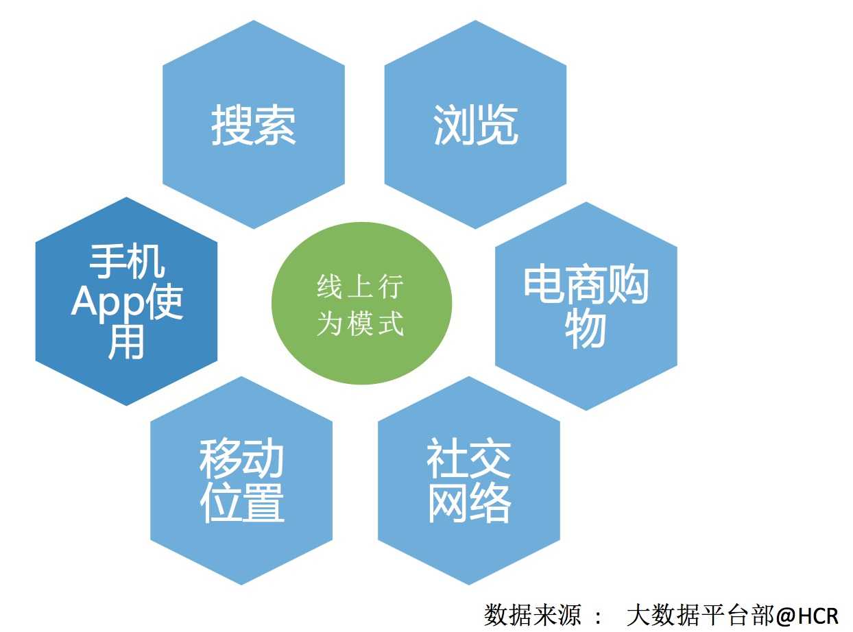 HCR认为,用户的行为数据(当前主要为线上行为)主要由下几种行为场景模式组成(这里浏览包含网页与视频)。当市面上大多数标签研究聚焦于搜索/浏览和购物行为数据时,我们选择了手机App使用行为这个独特的突破口。