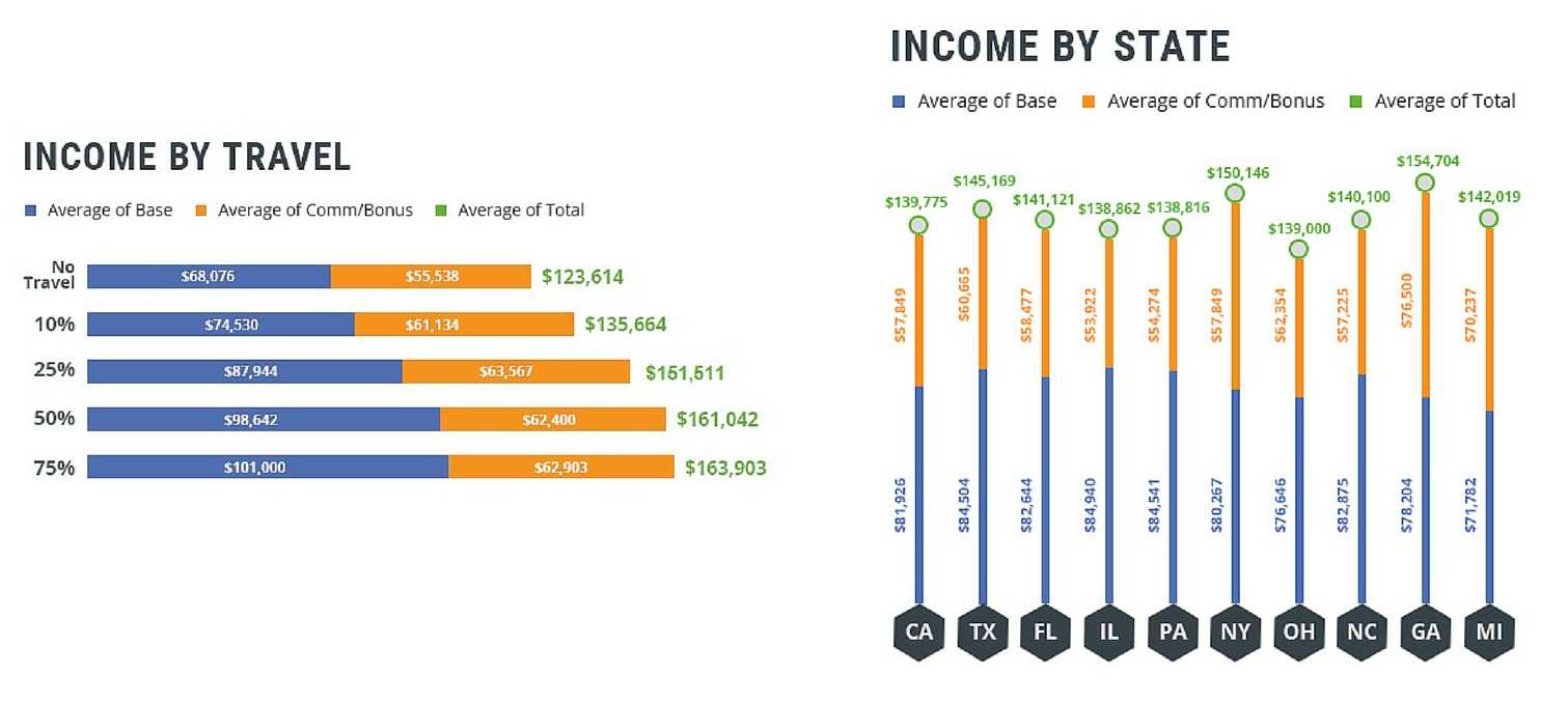 地理区域也会影响医药代表的收入,包括居住地和出差的多少。结果显示,出差越多的代表,其收入越高。出差占工作时间75%的人员,平均收入最高(16.3903万美元),出差占50%的人员,收入略低一些(16.1042万美元)。另外,生活地理区域也会影响收入。2015年调查显示,居住在夏威夷州的平均收入最高(18.875万美元),其次是罗德岛(16.5313万美元)。但这些地区的受访者人数不多,无统计学意义。