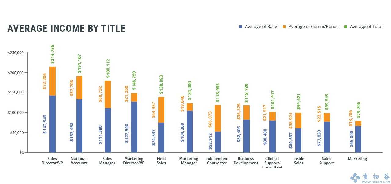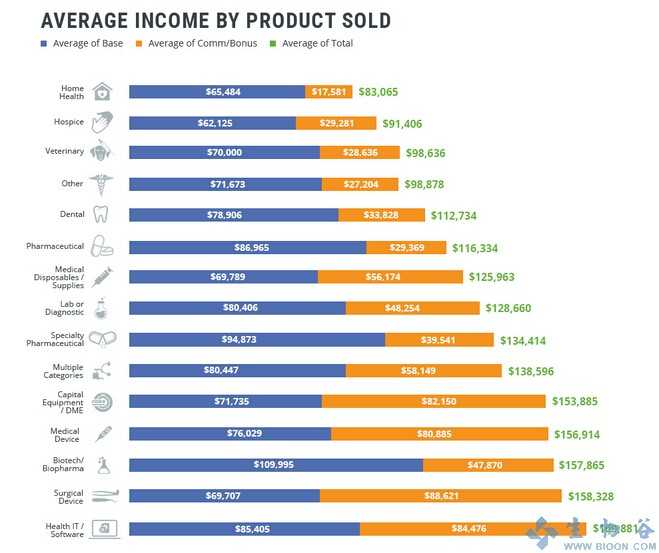那么,究竟哪一个细分行业赚的最多呢?2015年报告显示,医疗IT和软件行业赚的最多,平均年收入16.9881万美元(中位数15.5万美元),其次是手术设备,为15.8328万美元,排在第3位的是生物技术和生物制药,为15.7865万美元。尽管这3类细分行业的中位年收入为15.5万美元,但生物技术销售代表的平均基本工资在所有细分行业中最高,达到了10.9995万美元。