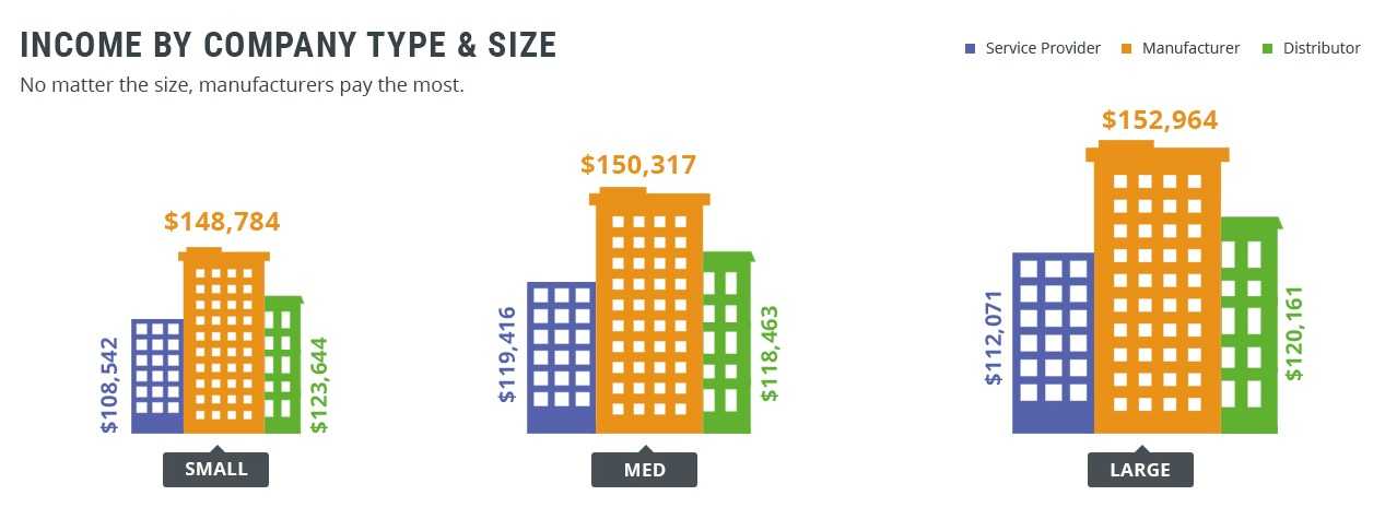 大部分受访者(69%)来自生产型公司,其余31%来自服务提供商和分销商。来自大型生产型公司的销售代表工资最高,为15.2964万美元。不过,公司规模大小似乎并不会对收入造成显着影响,因为中、小型生产型公司的代表工资也分别达到了15.0317万、14.8784万美元。