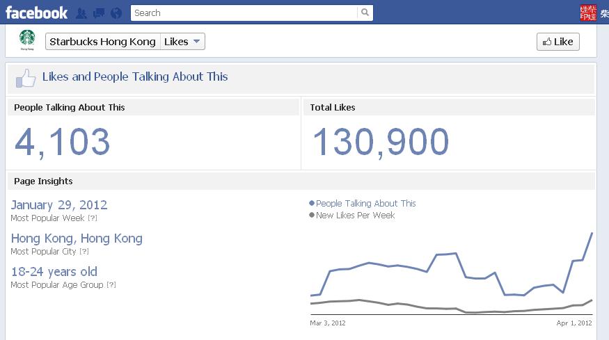 以香港两大咖啡连锁店为例,在行文时,Starbucks香港(星巴克香港)的Facebook Page粉丝数为130,900人;而Pacific Coffee的Facebook Page粉丝数为11,547人。虽然我不清楚双方投入了多少预算,但如果纯粹以粉丝数来定成败,Starbucks香港肯定赢『九条街』.以一介市民的观察,Starbucks香港的人流的确比Pacific Coffee优胜,而且绝少有「买一送一」类的促销活动,相信和它在品牌上的绝对优势有关.相反,虽然部份Pacific Coffee的人流不比Starbucks香港差(例如又一城店、鹰君中心店等),但是不少店的人流的确强差人意.因此,它做了不少「买一送一」类的促销活动,吸引了不少price sensitive的客户。