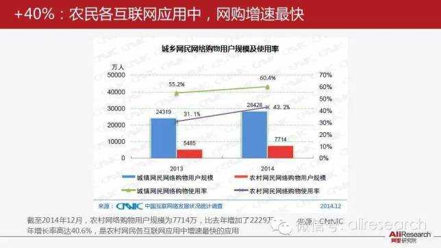 20张PPT解读2014年县域暨农村电商数据 7月8日,第二届中国县域电子商务峰会在浙江桐庐举办,本届县域峰会的主题是“小县域,大生态”。来自全国各地千余名电子商务先进县县长云集桐庐共同探讨农村电商的发展大业。会上,阿里研究院高级专家陈亮分享了2014年县域暨农村电商数据解读。 更多阅读:阿里研究院:阿里农产品电子商务白皮书(2015)数字农业报告:中国农村电商的发展经验阿里研究院:2015年中国县域电子商务研究报告阿里上市前的战略思考:对COO张勇的40问 数据运用在业务中的比重在日益增长手机淘宝生活圈大数据:深圳大学生活圈人均淘宝消费额达1.15万天猫双11支付宝充值险致2家银行瘫痪Hitwise:2012年7月8日-14日部分中国电子商务网站转化率数据淘宝数据:2011年天猫女装交易数据8种数据分析师必备方法闲鱼空巢青年租房数据阿里云推全新动态LOGO:计算和数据生生不息Tealium:客户数据的未来报告MAGNA:受众数据+创意优化的交叉点2024年数据和人工智能领导力报告Salesforce:2023年数据和分析报告