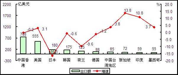 进口方面,复进口(423亿美元,-3.9%),其后五大进口来源地分别是:韩国(413亿美元,2.1%)、中国台湾地区(393亿美元,-2.5%)、日本(200亿美元,-3.0%)、马来西亚(135亿美元,-1.1%)和美国(99亿美元,-3.8%)。