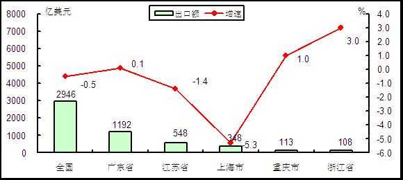 出口方面,排名前五位的省市分别是:广东省(1192亿美元、0.1%)、江苏省(548亿美元、-1.4%)、上海市(348亿美元、-5.3%)、重庆市(113亿美元、1.0%)和浙江省(108亿美元、3.0%)。贵州、山西、内蒙古等省份出口增长较快增速,均超过100%。