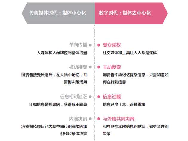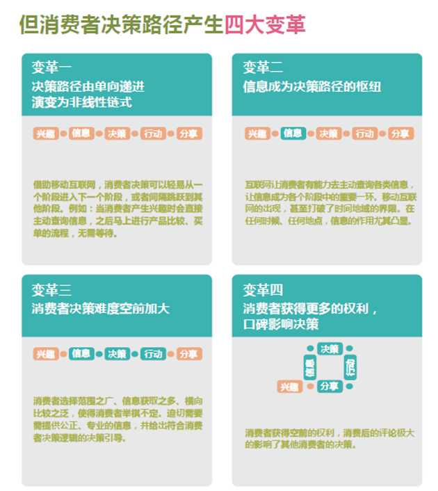 尽管如此,数字时代“产生兴趣-搜集信息-做出决策-实施行动-分享体验”的消费者决策五阶段依然存在,只不过消费路径上产生了四个大的变革:1. 借助移动互联网,消费者决策可以轻易从一个阶段进入下一个阶段,或者间隔跳跃到其他阶段。2. 在任何时候、任何地点,信息的作用都得到凸显。3. 丰富的信息和选择范围往往让消费者举棋不定,他们迫切需要公正、专业的信息和决策引导。4. 消费者的评论及口碑,极大的影响了其他消费者的决策。