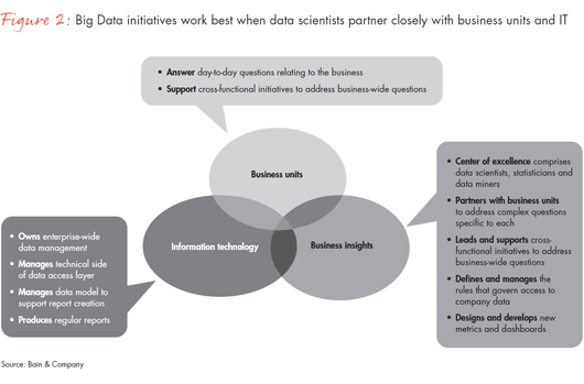 一家通信服务供应商创建了一种涵盖数据和分析团队、技术部门和一线职能部门(销售、市场、客户运营和产品开发)的合作模式。在这个模式中,商业智能团队(数据科学家、统计学、数据挖掘工程师)与各业务部门紧密配合,通过对海量的内部数据进行分析来解决具体问题。
