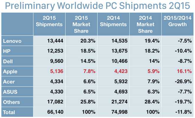 据估计,第二季度苹果计算机销量略低于514万台,是仅次于联想(1344万台)、惠普(1225万台)和戴尔(956万台)的第四大计算机厂商。宏碁和华硕计算机销量低于苹果,同约为433万台,宏碁略高于华硕。