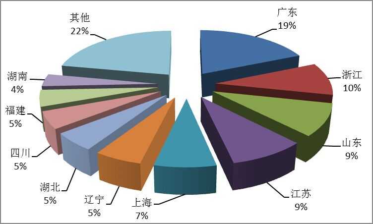 第一季度旅行社国内旅游组织人次排名前十位的地区由高到低依次为广东、浙江、山东、江苏、上海、辽宁、湖北、四川、福建、湖南(见图3)。
