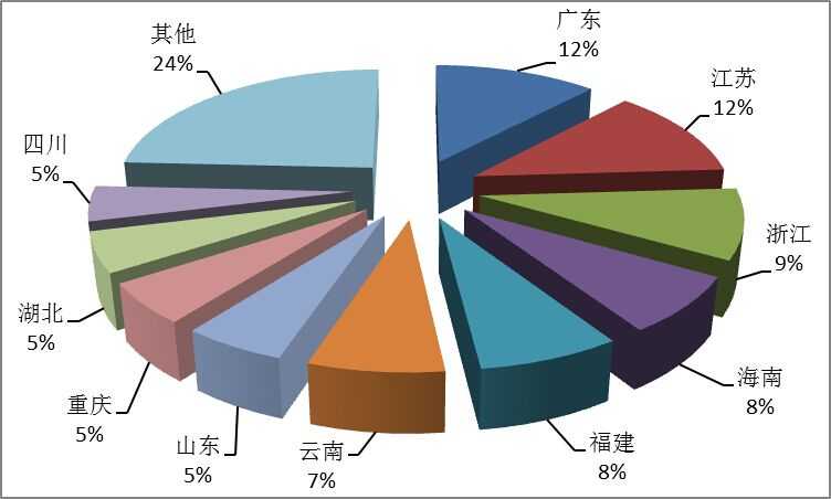 第一季度旅行社国内旅游接待人次排名前十位的地区由高到低依次为广东、江苏、浙江、海南、福建、云南、山东、重庆、湖北、四川(见图4)。