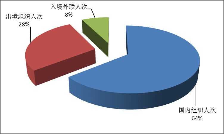 按照入境外联人次、国内组织人次、出境组织人次三项指标,国内旅游、出境旅游、入境旅游市场人次所占份额依次为8%、64%、28%(见图6),同比分别持平、下降2%和增长2%。