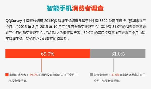 QQSurvey中国在线调研2015Q3智能手机调查是基于对中国3322位网民进行“预期未来三个月内(2015年8月-2015年10月底)是否会购买智能手机”,其中有31.0%的消费者愿意未来三个月内购买智能手机,我们称之为潜在消费者;69.0%的网民没有意向在未来三个月内购买智能手机,我们称之为非潜在的消费者 。