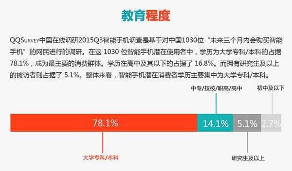 QQSurvey中国在线调研2015Q3智能手机调查是基于对中国1030位“未来三个月内会购买智能手机”的网民进行的调研。在这1030位智能手机潜在使用者中,学历为大学专科/本科的占据78.1%,成为最主要的消费群体。学历在高中及其以下的占据了16.8%。而拥有研究生及以上的被访者则占据了5.1%。整体来看,智能手机潜在消费者学历主要集中为大学专科/本科。