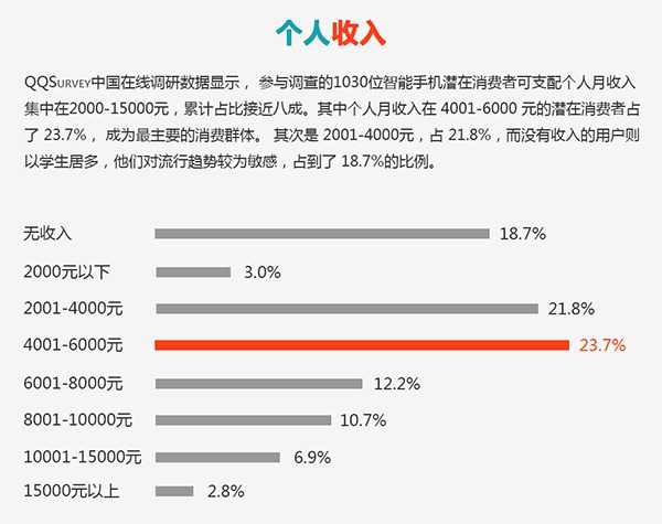 QQSurvey中国在线调研数据显示,参与调查的1030位智能手机潜在消费者可支配个人月收入集中在2000-15000元,累计占比接近八成。其中个人月收入在4001-6000元的潜在消费者占了23.7%,成为最主要的消费群体。其次是2001-4000元,占21.8%,而没有收入的用户则以学生居多,他们对流行趋势较为敏感,占到了18.7%的比例。