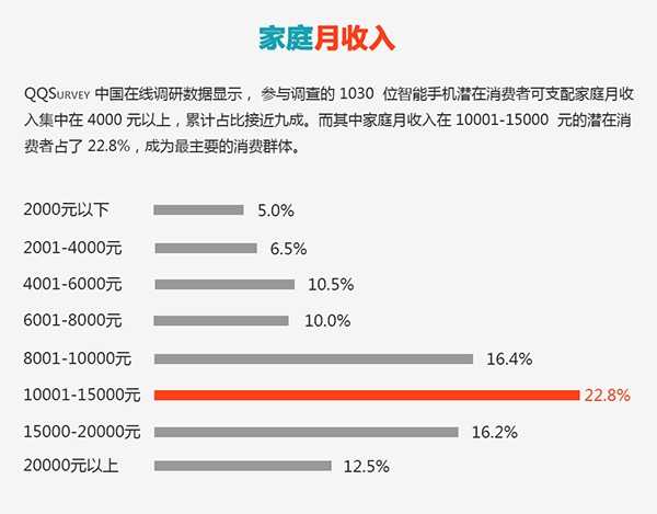 QQSurvey中国在线调研数据显示,参与调查的1030位智能手机潜在消费者可支配家庭月收入集中在4000元以上,累计占比接近九成。而其中家庭月收入在10001-15000元的潜在消费者占了22.8%,成为最主要的消费群体。