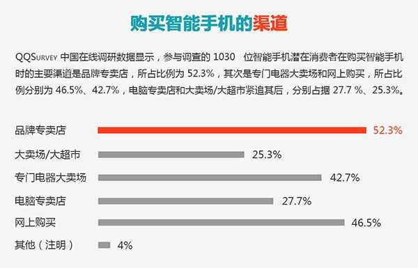 QQSurvey中国在线调研数据显示,参与调查的1030位智能手机潜在消费者在购买智能手机时的主要渠道是品牌专卖店,所占比例为52.3%,其次是专门电器大卖场和网上购买,所占比例分别为46.5%、42.7%,电脑专卖店和大卖场/大超市紧追其后,分别占据27.7 %、25.3%。