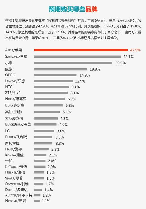 智能手机潜在消费者中针对“预期购买哪些品牌”方面,苹果(Apple) 、三星(Samsung)和小米占主导地位,分别占了47.9%、42.1%和39.9%比例。其次是魅族、OPPO,分别占了19.8%、14.9%,紧追其后的是联想,占了12.9%。其他品牌的购买意向都低于百分之十,由此可以看出在消费者心目中苹果(Apple) 、三星(Samsung)和小米还是占据绝对主导地位。