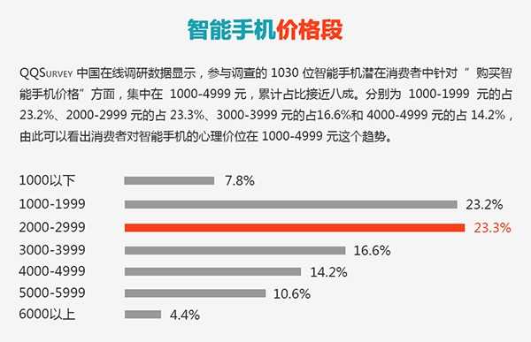 QQSurvey中国在线调研数据显示,参与调查的1030位智能手机潜在消费者中针对“购买智能手机价格”方面,集中在1000-4999元,累计占比接近八成。分别为1000-1999元的占23.2%、2000-2999元的占23.3%、3000-3999元的占16.6%和4000-4999元的占14.2%,由此可以看出消费者对智能手机的心理价位在1000-4999元这个趋势。