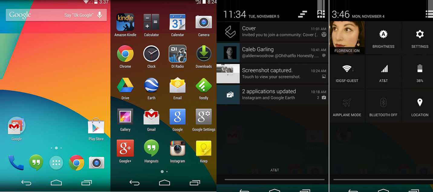 上面这张图拼接了从 Android 1.5 到 Android 4.2 的界面;从上面你可以看到 Android 是如何一步一步演变的。由于其中缺少了 Android 4.4 和 Android 5.0 的截图,所以下面单独给出。