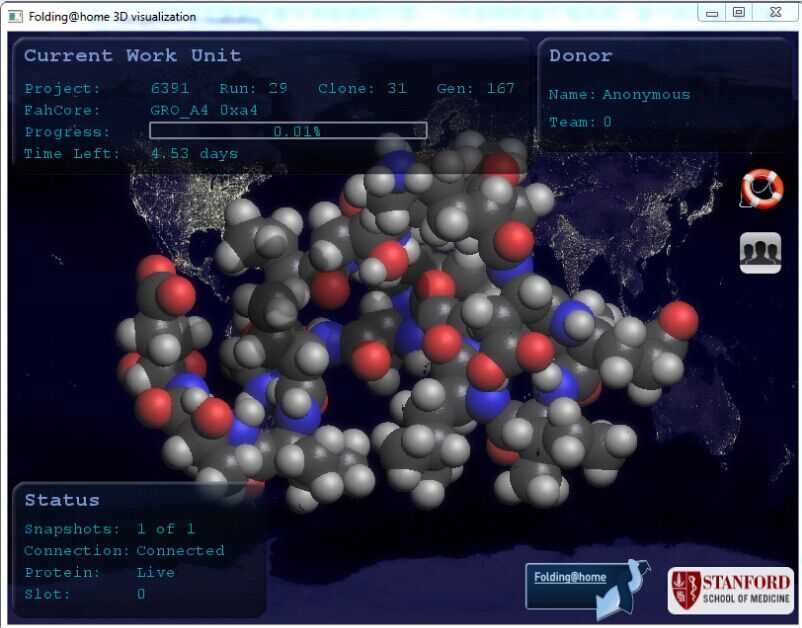 注:Folding@home是一个研究研究蛋白质折叠,误折,聚合及由此引起的相关疾病的分布式计算工程。Folding@home的中文含义就是“在家折叠”, “折叠(Folding)”是蛋白质的最重要的性状之一,如果蛋白质没有正确地折叠,人类会遭受某些病症的折磨。许多疾病,诸如阿兹海默症(Alzheimer’s),疯牛病(Mad Cow/BSE),还有帕金森氏症(Parkinson’s)等,特别是一些癌症疾病等,正是由于一些细胞内的重要蛋白发生突变,导致蛋白质聚沉或错误折叠而造成的。