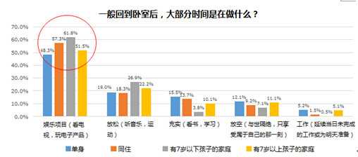 相比早晨的匆忙,人们在晚上相对比较悠闲。近半数的被访者都在23点之后才入睡。57%被访者的晚上时间都花在娱乐项目上,比如看电视和玩电子产品。其中,也不乏一些有孩子的被访家庭。除了娱乐项目,22.8%被访者表示也会在卧房里做一些能让自己放松心情的事情,比如说听音乐、做运动。