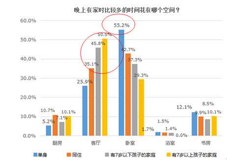 55.2%的单身被访者选择在卧室度过大部分晚上的时间,而近半数的有孩子被访者较多晚上时间花在客厅陪伴家人