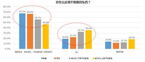 在调查中我们发现,大部分的被调查者多多少少都会有收纳空间不足的生活困扰:有89%的人表示因为家里杂物太多,所以常常会有找不到东西的情况发生。然而,面对这些困扰,多数人都习惯在潜意识里用自己的方式来解决问题或和问题妥协,比如说当浴室里没有地方储藏一些洗漱产品时,许多家庭就会选择增加购物的频率来减少所需要的收纳空间;许多人在发现收纳空间不够的时候,会把放不下的东西整理到不是作收纳用的空间(比如把把婴儿床当堆积衣物的地方),甚至是另外一个空间(比如把洗漱用品储藏在卧室,把父母家当第二个储藏空间用来堆放一些不用的东西)。我们发现,88%被调查者表示他们意识到家里近五分之一的空间放置着不需要的东西,但是在面临收纳空间不足的难题时,他们依然不习惯舍弃一些不用的东西,而是用他们自己的方式和问题生活在一起。其中,有67%的独居被访者会选择囤积杂物而只有19%的人会选择丢弃;相比之下,近1/3有孩子的被访者表示会考虑将有些不用的东西送人,比如说孩子的旧衣服和旧用品。