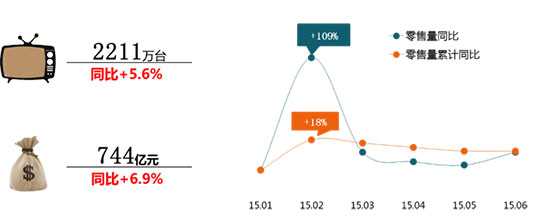 整体而言2015年上半年彩电市场规模增长,据奥维云网(AVC)推总数据显示,2015年上半年彩电市场零售量达2211万台,同比增长5.6%;零售额达744亿元,同比增长6.9%。