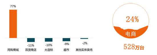 2015年上半年彩电市场分渠道同比变化及线上规模(数据源:奥维云网(AVC)全渠道推总数据)