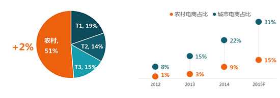 2015年上半年城级结构变化及城镇与农村电商占比变化