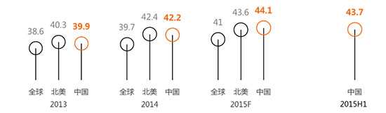2015年上半年彩电大尺寸化持续,据奥维云网(AVC)推总数据显示,2015年上半年彩电销售面积达1210万平方米,同比增长16%。彩电销售面积的增长幅度大于零售量增长,单个彩电的销售面积在增长,彩电尺寸在扩大。据奥维云网(AVC)推总数据显示,2015年上半年中国彩电的平均尺寸已达43.7英寸,2015年全年有望超过北美,增长至44.1英寸。