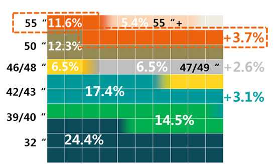 就尺寸结构而言,55英寸已成为厂商竞相逐鹿的尺寸。2015年上半年55英寸新进入品牌包含了运营商大麦和互联网厂商17TV,55英寸品牌竞争更加激烈。据奥维云网(AVC)推总数据显示,2015年上半年彩电市场55英寸的零售量占比达11.6%,同比增长3.7个百分点,增长幅度最大。中小尺寸产品之间的替代关系明显,其中由于40、42、43英寸对32英寸产品的替代,使得32英寸电视的零售量占比下降8.6个百分点。