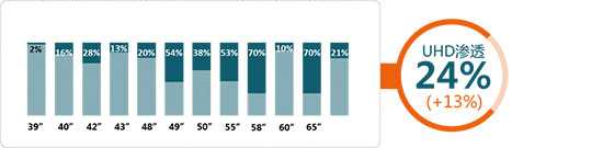 2015年上半年彩电高端产品市场份额不断扩大。据奥维云网(AVC)推总数据显示,2015年上半年UHD电视的市场渗透率为24%,同比增长13个百分点。上游面板厂商主推大尺寸UHD面板,整机大尺寸UHD渗透较高,其中55寸UHD电视渗透率达53%,65寸UHD电视渗透率达70%。