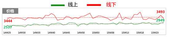 据奥维云网(AVC)周度监测数据显示,15W26周彩电线上均价2949元,线下均价3493元,彩电均价喜现回升。就价格段来看,4000元以下产品最受欢迎,市场占比达75%,其中2000-2999价格段的产品的结构占比增长3个百分点,增幅最大。