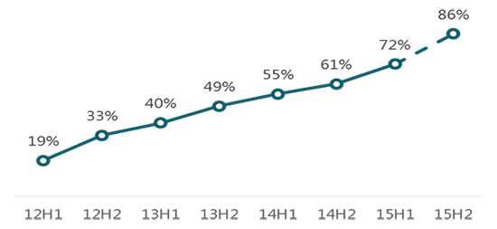 2012-2015年智能电视渗透率变化(数据源:奥维云网(AVC)全渠道推总数据)
