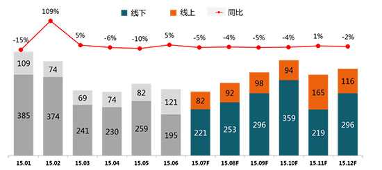 2015年分月度彩电规模(数据源:奥维云网(AVC)全渠道推总&预测数据)