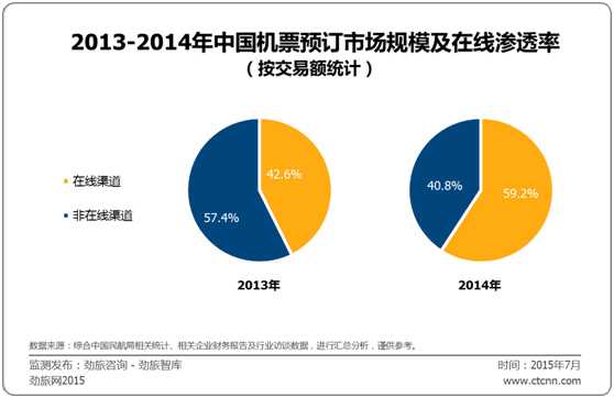 劲旅咨询-劲旅智库监测数据显示,2014年,中国机票预订市场总交易额约为3912.3亿元,较2013年3622.5亿元同比增长8%,其中在线市场规模达2316.6亿元,较2013年1544.6亿元同比增长近50%,在线渗透率为59.2%,较2013年42.6%增长达17个百分点,两年间,机票预订在线渠道成功逆袭线下。