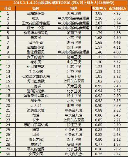 因政策因素,电视荧屏开年即不同往年。各大卫视原来的开年剧变成了“跨年剧”。年初时晚间收视率集体跳水,黄金时段跌幅甚至曾达20%。经历了第一轮挫折后,各大卫视纷纷出招。浙江卫视采用1.5轮跟播模式极大提高了电视剧的性价比;湖南卫视调整了晚间排播方式,730节目带+金鹰独播剧场收效甚佳。各大卫视的差异化竞争更趋明显,自制剧、定制剧增多,“周播剧”成为强势卫视的主打牌。