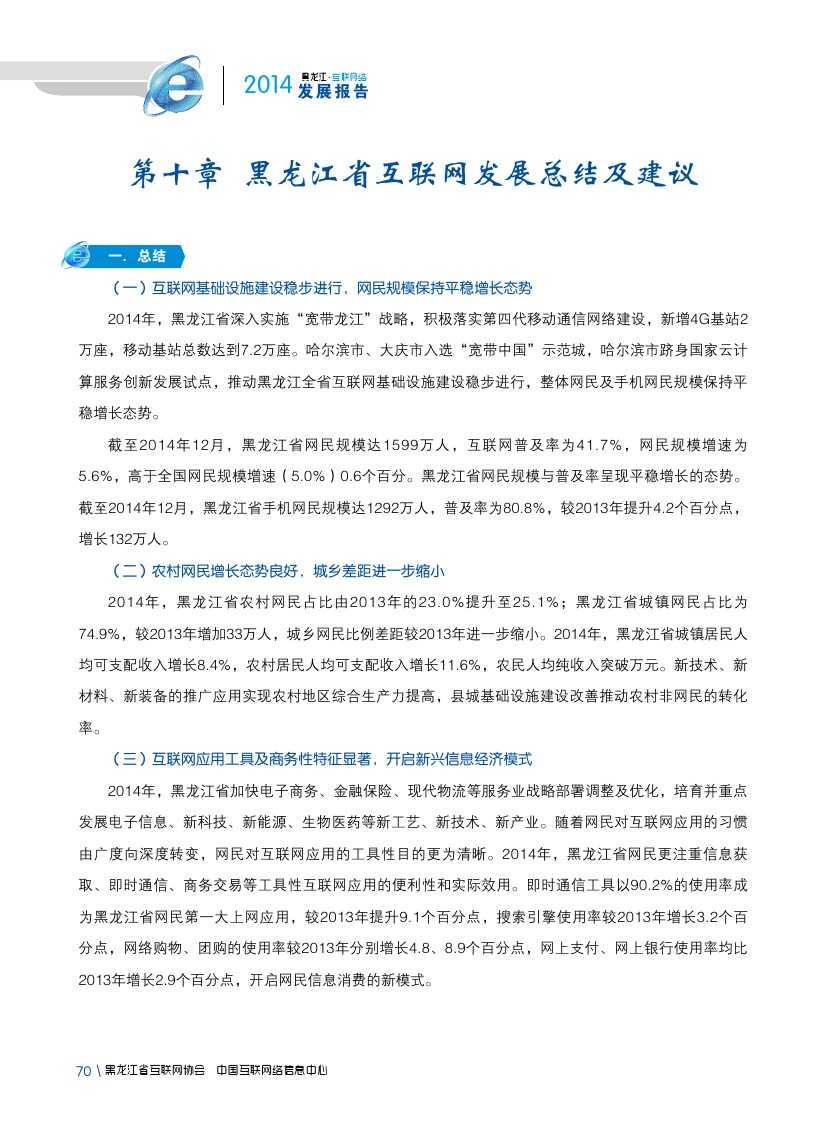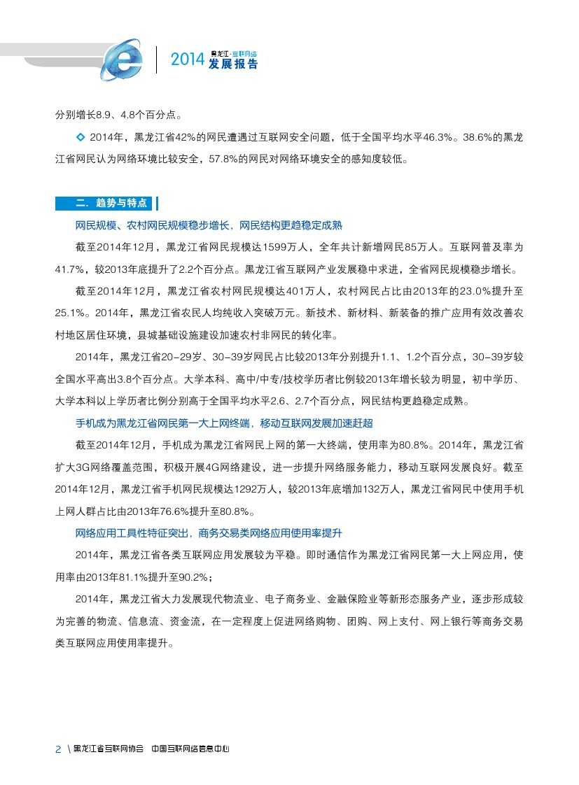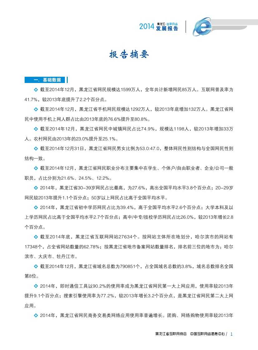 2014年,黑龙江省深入实施“五大规划”发展战略和十大重点产业建设,及时出台促进经济稳增长65条措施,深入挖掘经济增长潜力,经济呈现平稳快速增长。互联网建设及发展呈现出良好态势,网民规模平稳增长,网络基础设施建设及网络技术应用能力有所提升。
