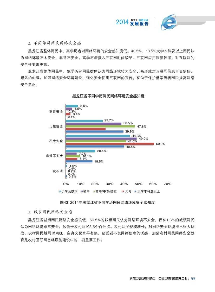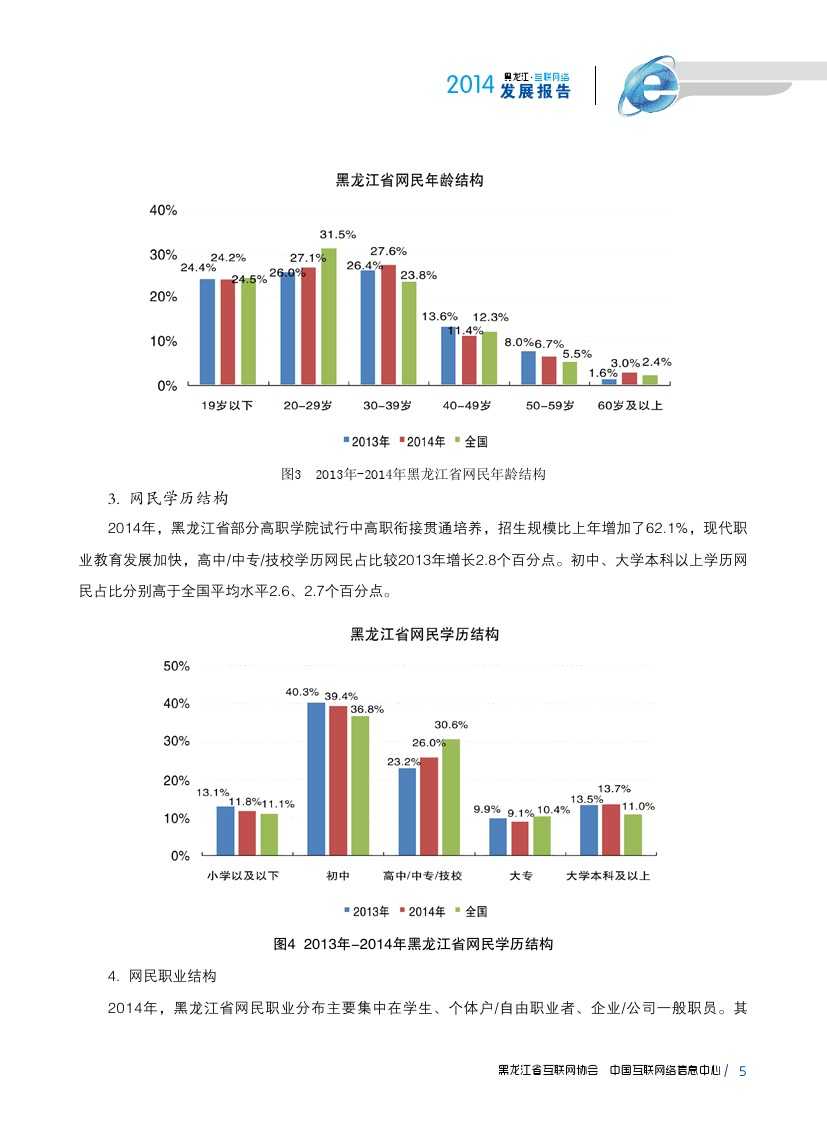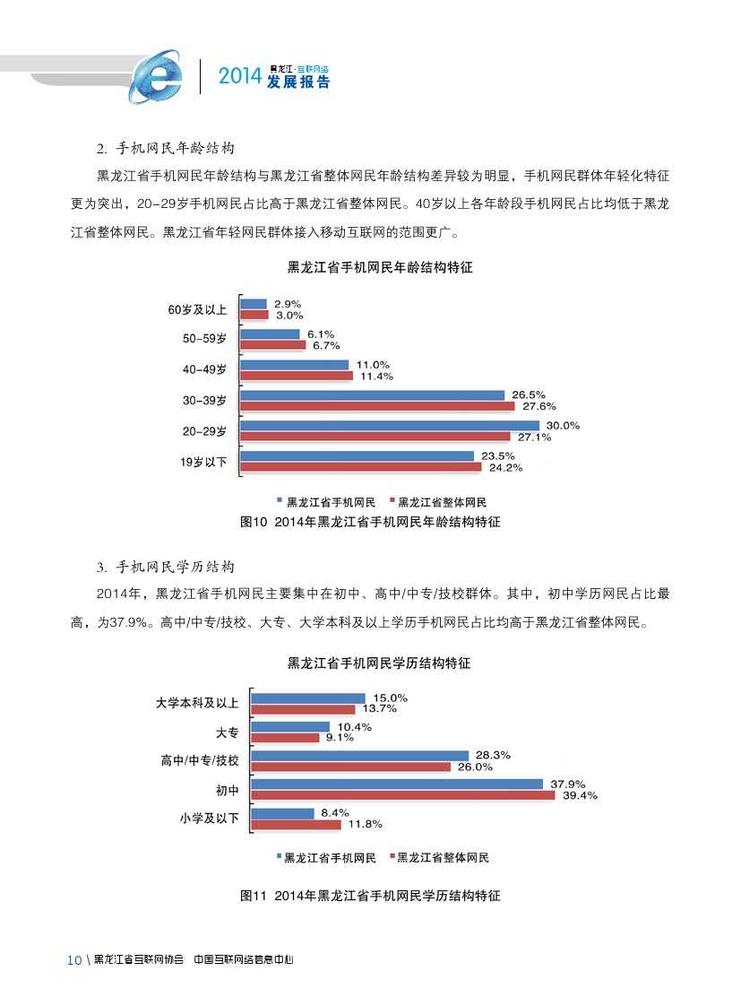2014年,黑龙江省20-29岁、30-39岁网民占比较2013年分别提升1.1、1.2个百分点,30-39岁较全国水平高出3.8个百分点。大学本科、高中/中专/技校学历者比例较2013年增长较为明显,初中学历、大学本科以上学历者比例分别高于全国平均水平2.6、2.7个百分点,网民结构更趋稳定成熟。