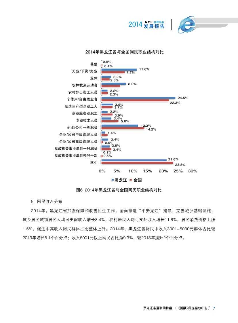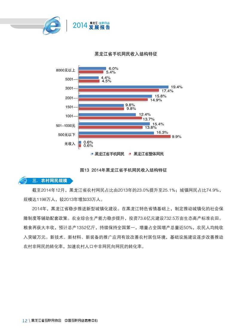 截至2014年12月,黑龙江省农村网民规模达401万人,农村网民占比由2013年的23.0%提升至25.1%。2014年,黑龙江省农民人均纯收入突破万元。新技术、新材料、新装备的推广应用有效改善农村地区居住环境,县城基础设施建设加速农村非网民的转化率。