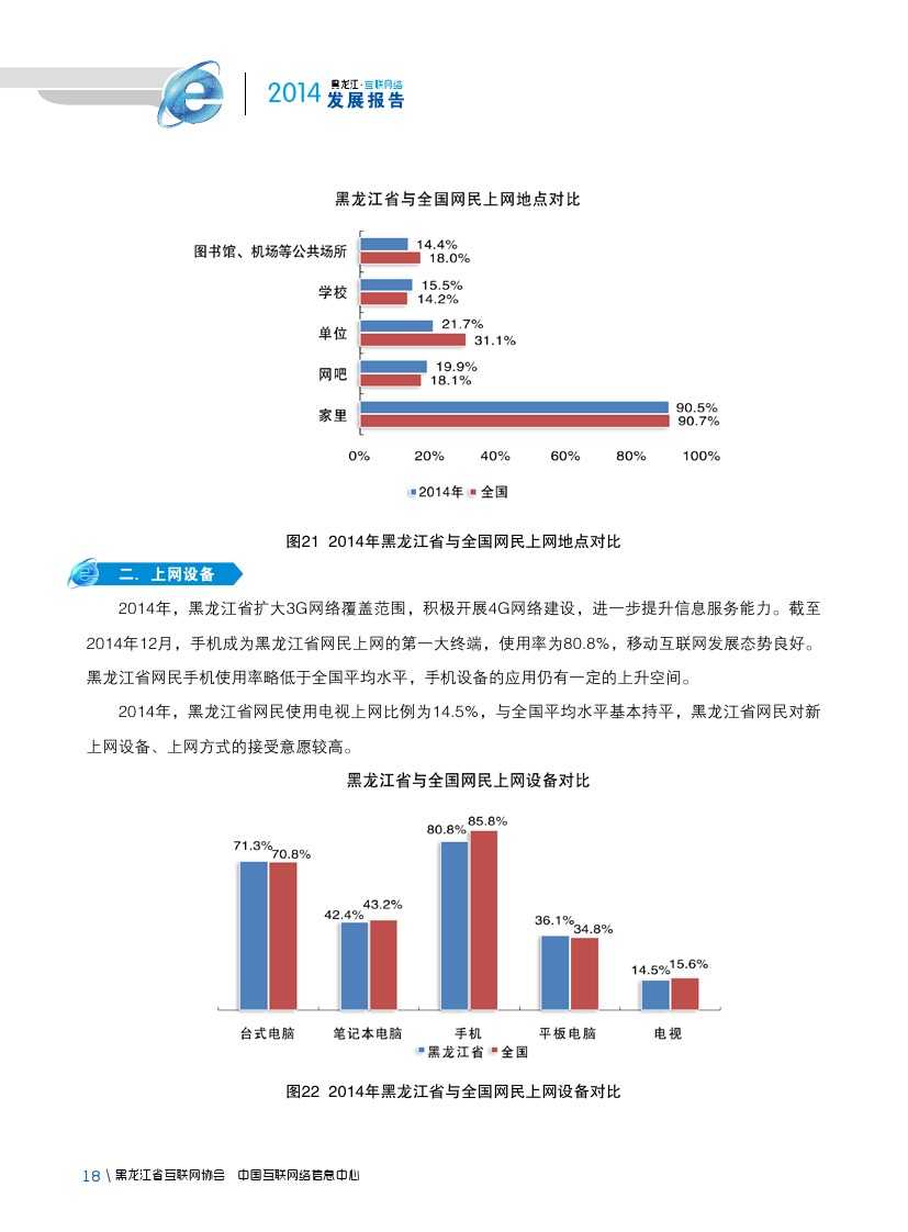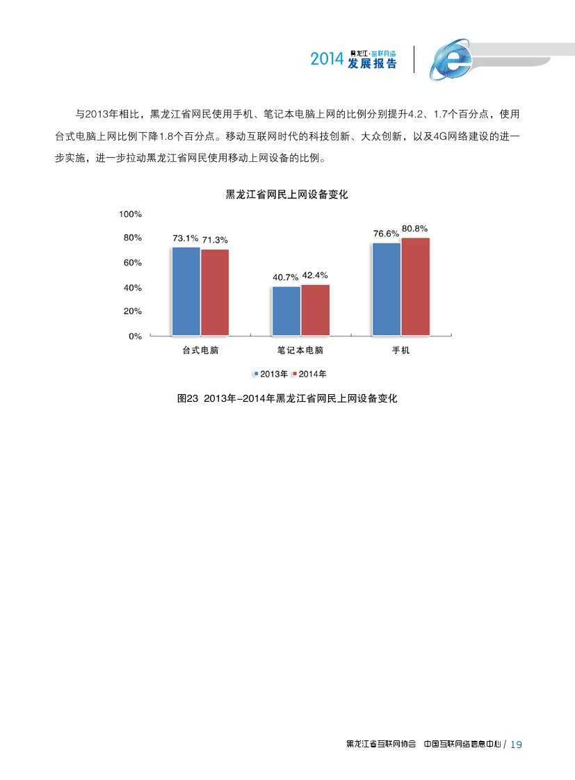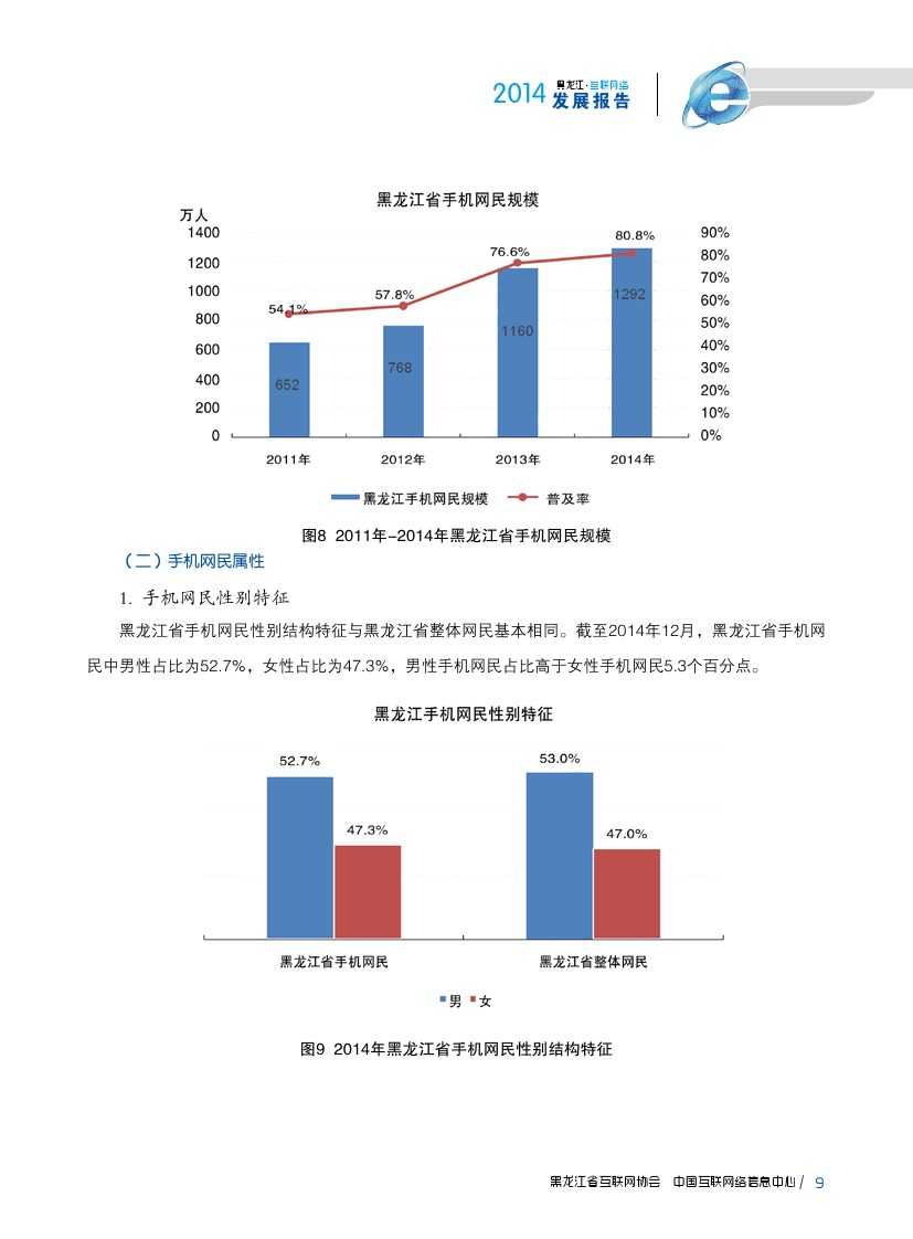 截至2014年12月,手机成为黑龙江省网民上网的第一大终端,使用率为80.8%。2014年,黑龙江省扩大3G网络覆盖范围,积极开展4G网络建设,进一步提升网络服务能力,移动互联网发展良好。截至2014年12月,黑龙江省手机网民规模达1292万人,较2013年底增加132万人,黑龙江省网民中使用手机上网人群占比由2013年76.6%提升至80.8%。