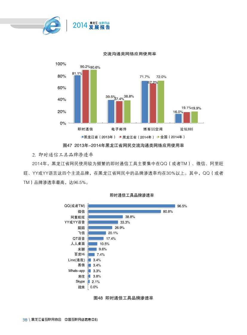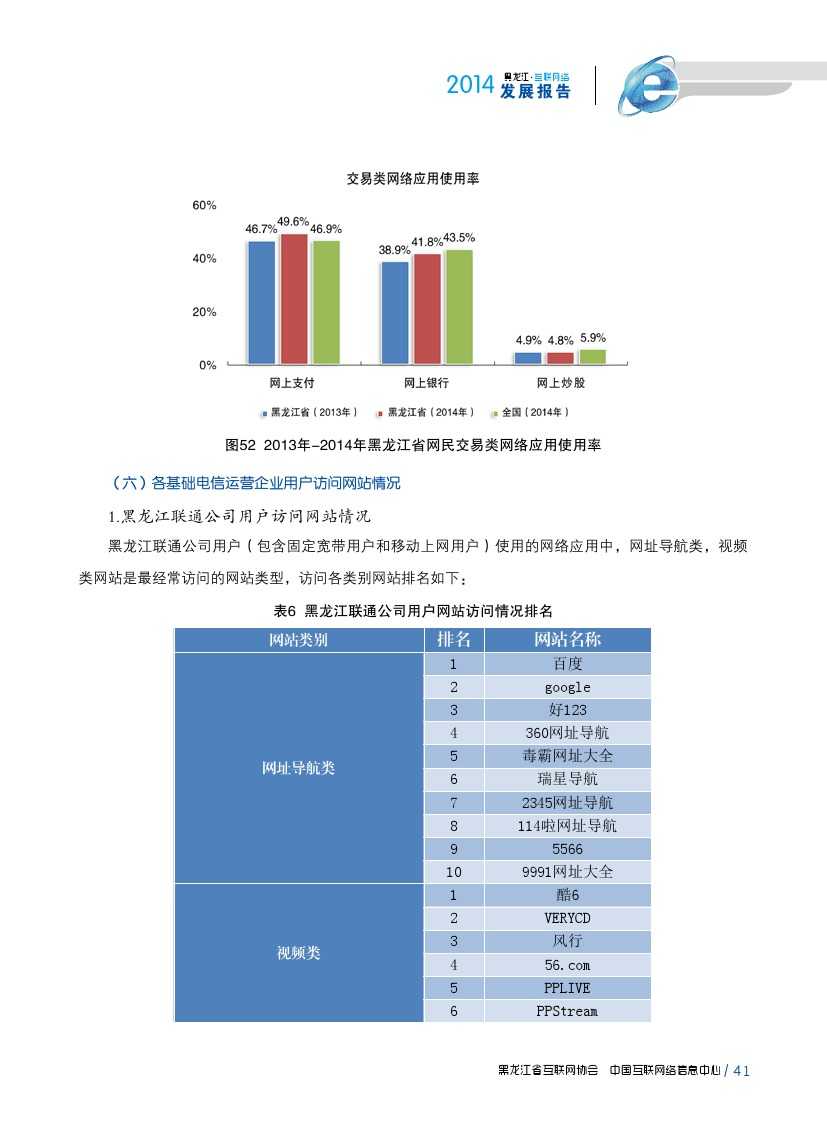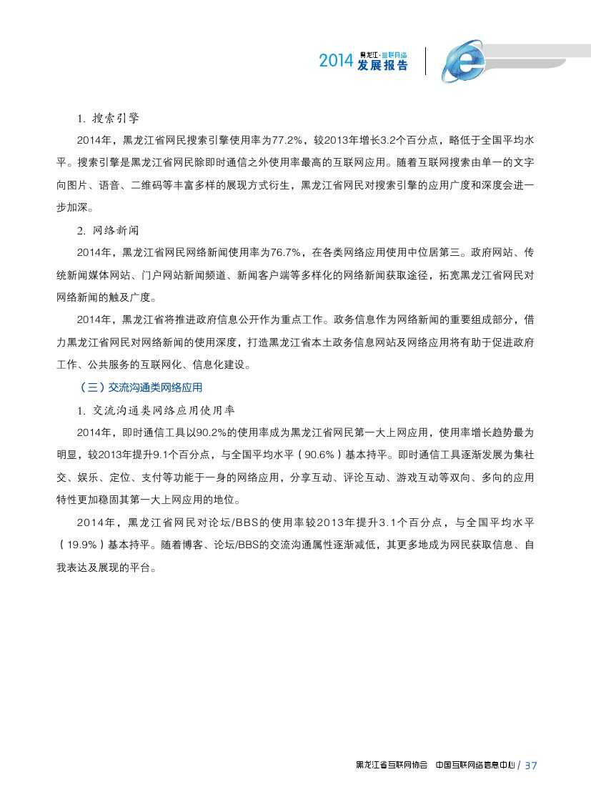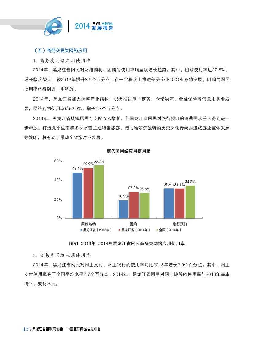 2014年,黑龙江省各类互联网应用发展较为平稳。即时通信作为黑龙江省网民第一大上网应用,使用率由2013年81.1%提升至90.2%;2014年,黑龙江省大力发展现代物流业、电子商务业、金融保险业等新形态服务产业,逐步形成较为完善的物流、信息流、资金流,在一定程度上促进网络购物、团购、网上支付、网上银行等商务交易类互联网应用使用率提升。